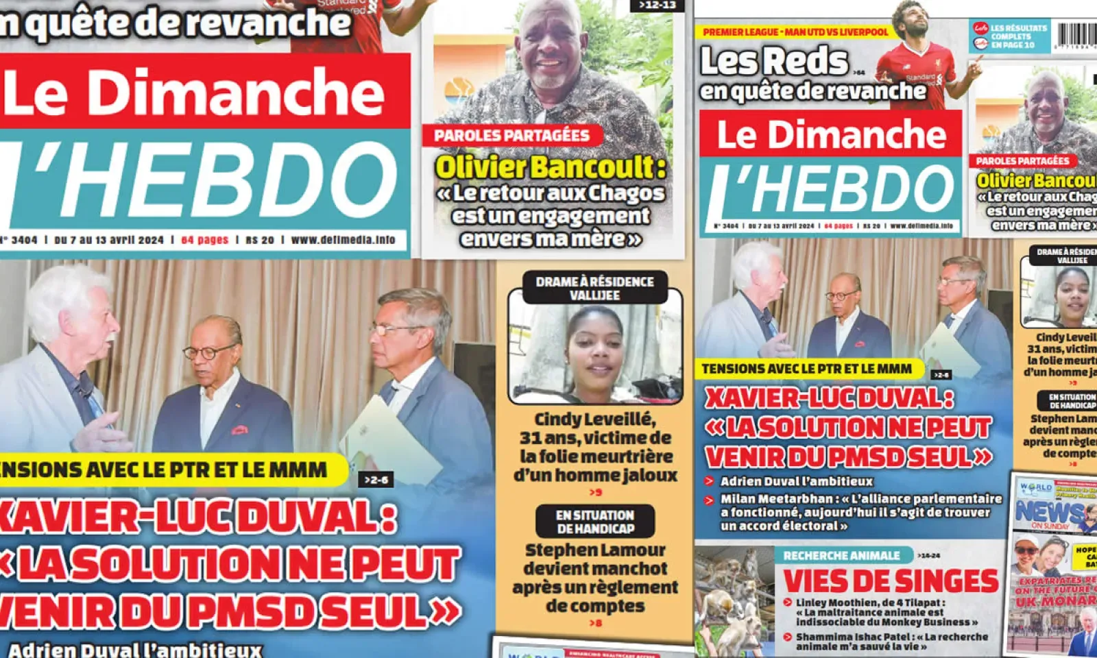 ? Voici la Une de Le Dimanche/L'Hebdo. Le journal est en vente à Rs 20 l'exemplaire aux endroits habituels (supermarchés, boutiques, tabagies, superettes). Bonne lecture !