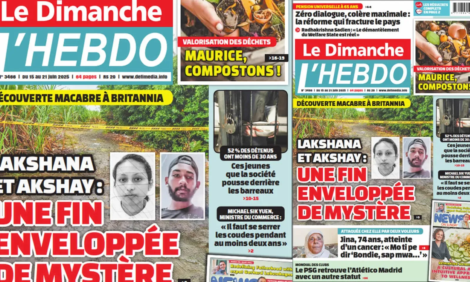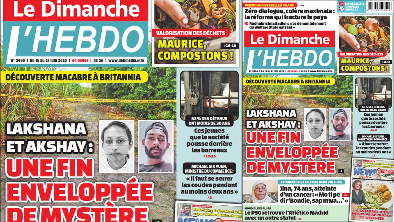 ? Voici la Une de Le Dimanche/L'Hebdo. Le journal est en vente à Rs 20 l'exemplaire aux endroits habituels (supermarchés, boutiques, tabagies, superettes). Bonne lecture !