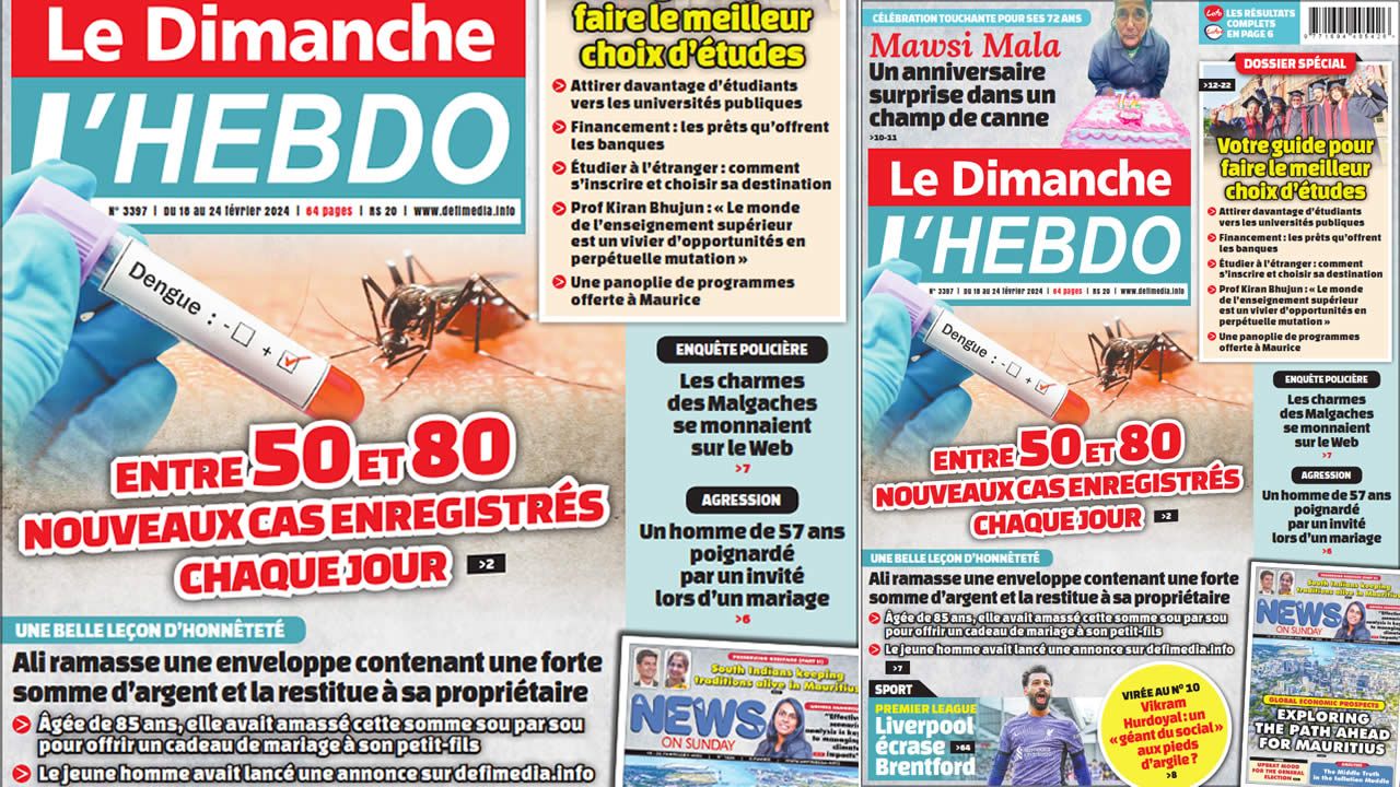 ? Voici la Une de Le Dimanche/L'Hebdo. Le journal est en vente à Rs 20 l'exemplaire aux endroits habituels (supermarchés, boutiques, tabagies, superettes). Bonne lecture !