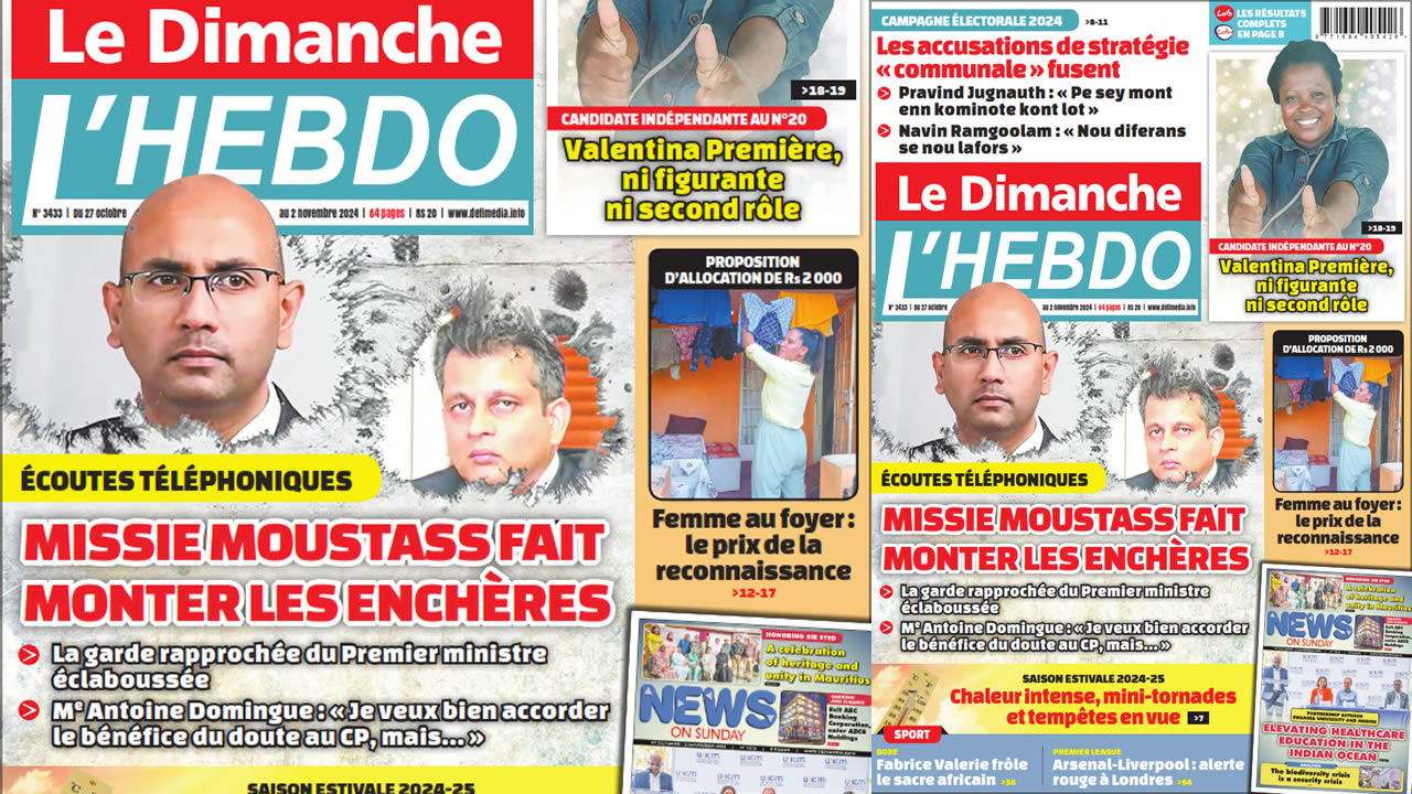 ? Voici la Une de Le Dimanche/L'Hebdo. Le journal est en vente à Rs 20 l'exemplaire aux endroits habituels (supermarchés, boutiques, tabagies, superettes). Bonne lecture !