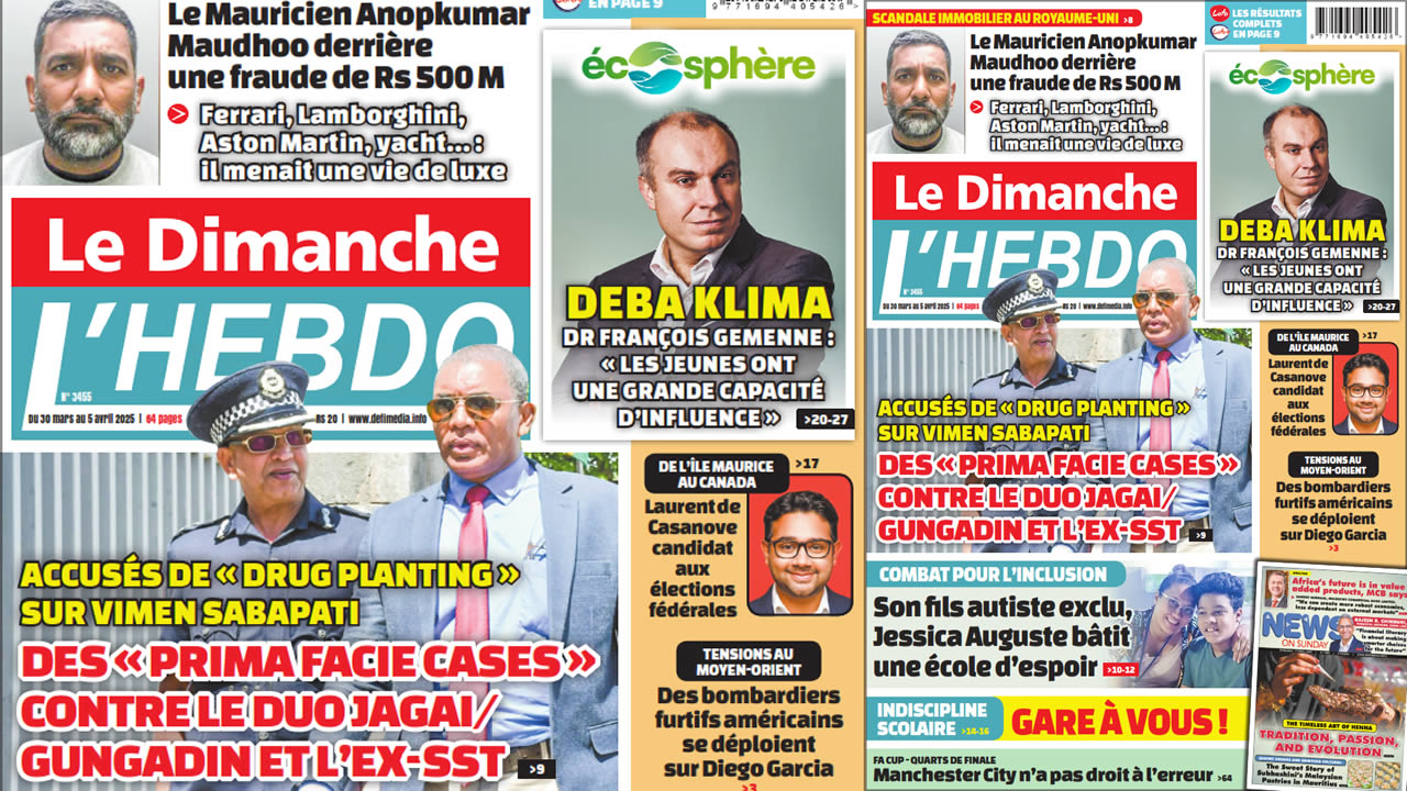 ? Voici la Une de Le Dimanche/L'Hebdo. Le journal est en vente à Rs 20 l'exemplaire aux endroits habituels (supermarchés, boutiques, tabagies, superettes). Bonne lecture !