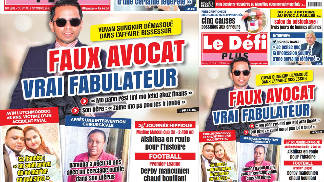? Voici la Une du Défi Plus. Le journal est en vente à Rs 20 l'exemplaire aux endroits habituels (supermarchés, boutiques, tabagies, superettes). Bonne lecture !