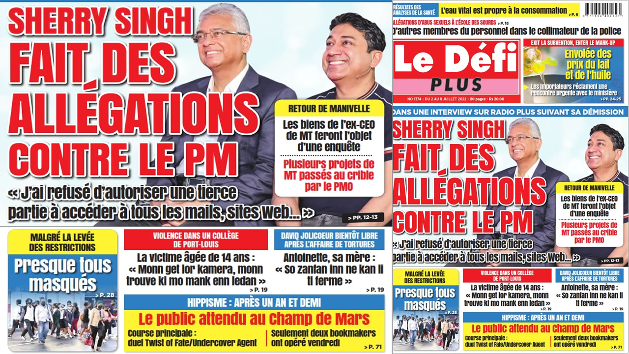 Image ? Voici la Une du Défi Plus. Le journal est en vente à Rs 20 l'exemplaire aux endroits habituels (supermarchés, boutiques, tabagies, superettes). Bonne lecture ! Publicité View the discussion thread.