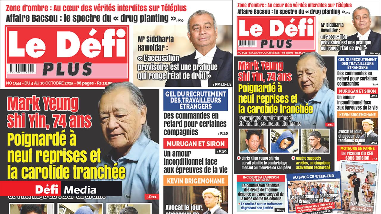 ? Voici la Une du Défi Plus. Le journal est en vente à Rs 25 l'exemplaire aux endroits habituels (supermarchés, boutiques, tabagies, superettes). Bonne lecture !