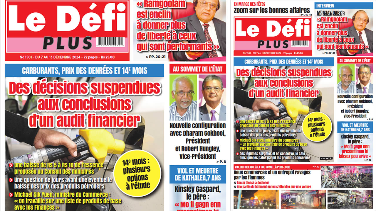 Voici la Une du Défi Plus. Le journal est en vente à Rs 25 l'exemplaire aux endroits habituels (supermarchés, boutiques, tabagies, superettes). Bonne lecture !