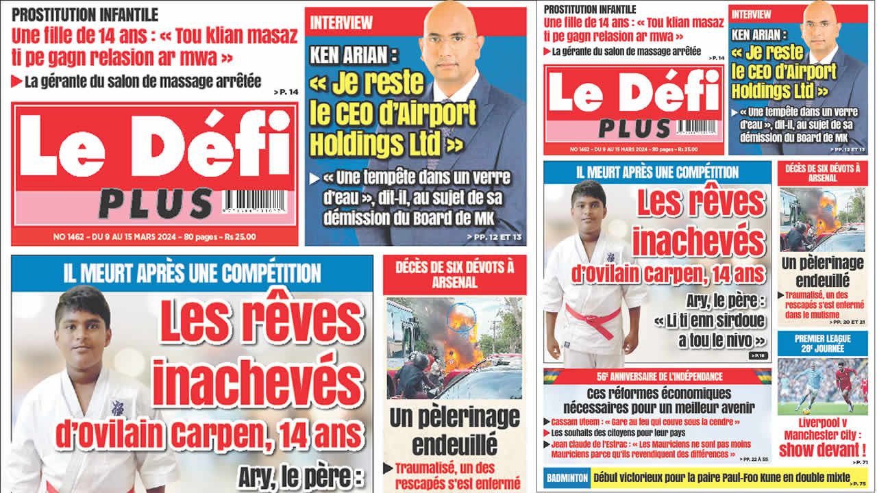 ? Voici la Une du Défi Plus. Le journal est en vente à Rs 25 l'exemplaire aux endroits habituels (supermarchés, boutiques, tabagies, superettes). Bonne lecture !