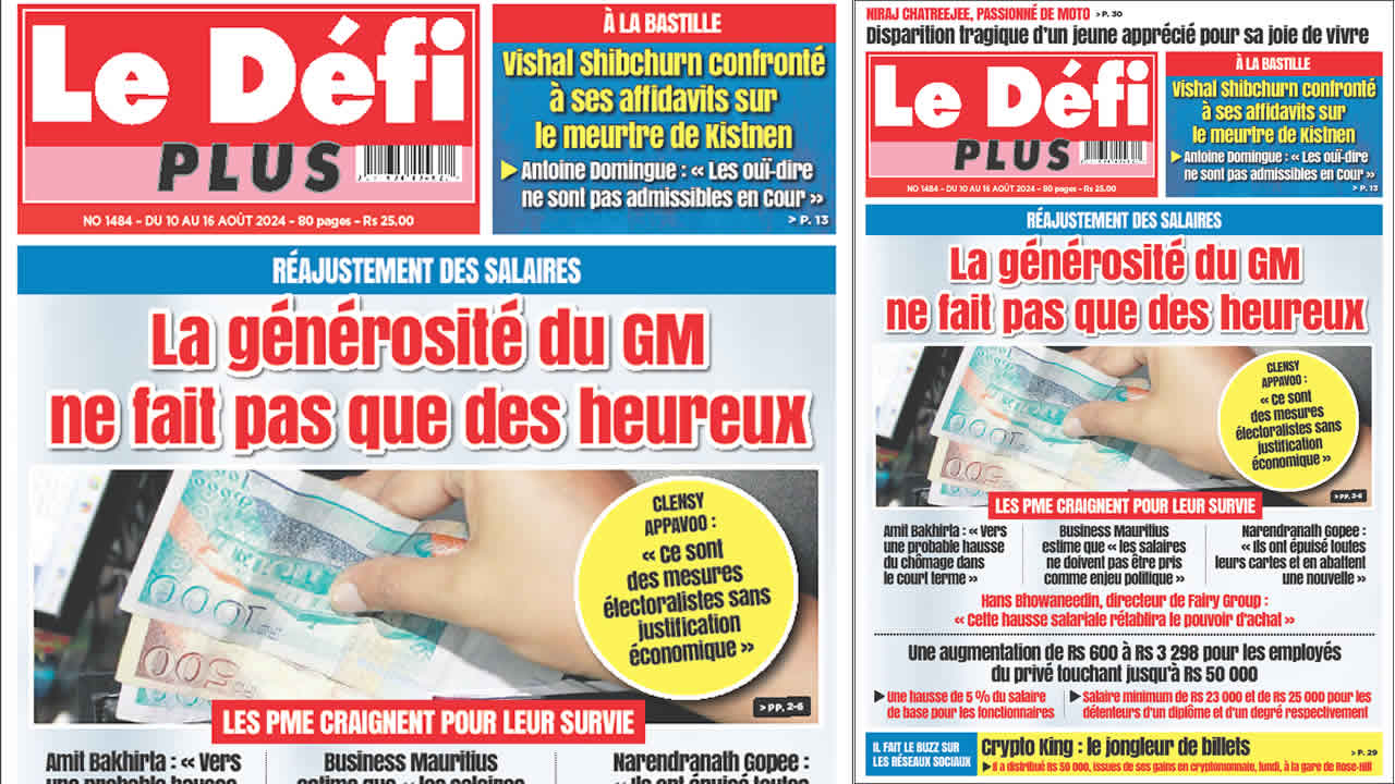 ? Voici la Une du Défi Plus. Le journal est en vente à Rs 25 l'exemplaire aux endroits habituels (supermarchés, boutiques, tabagies, superettes). Bonne lecture !