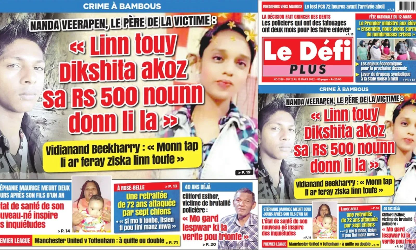 C’est un homme anéanti qui s’est confié au Défi Plus. Pour Nanda Veerapen, le père de Dikshita, la vie s’est arrêtée le lundi 7 mars. Jour où sa fille de 24 ans a été sauvagement tuée par Vidianand Beekharry, son compagnon de 28 ans. Il revient que le couple battait de l’aile depuis quelques années. Nanda, qui ne voyait pas cette relation d’un bon œil au départ, ne comprend pas la décision de sa fille de rester avec un homme malgré tous les problèmes qu’elle a connus. Pour ce père, c’est pour une question d’argent que Vidianand Beekharry a tué sa fille.