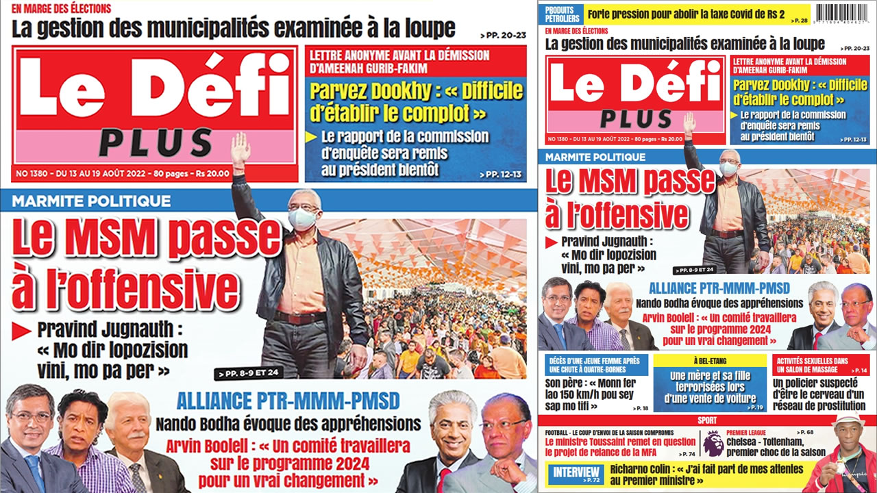 Image ? Voici la Une du Défi Plus. Le journal est en vente à Rs 20 l'exemplaire aux endroits habituels (supermarchés, boutiques, tabagies, superettes). Bonne lecture ! Publicité View the discussion thread.