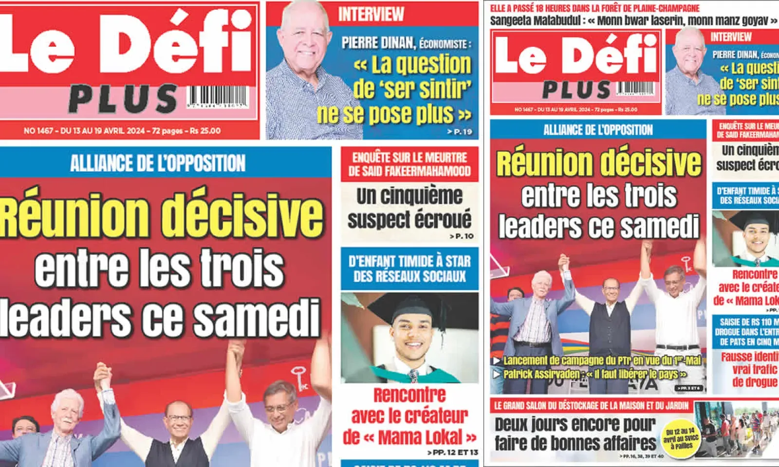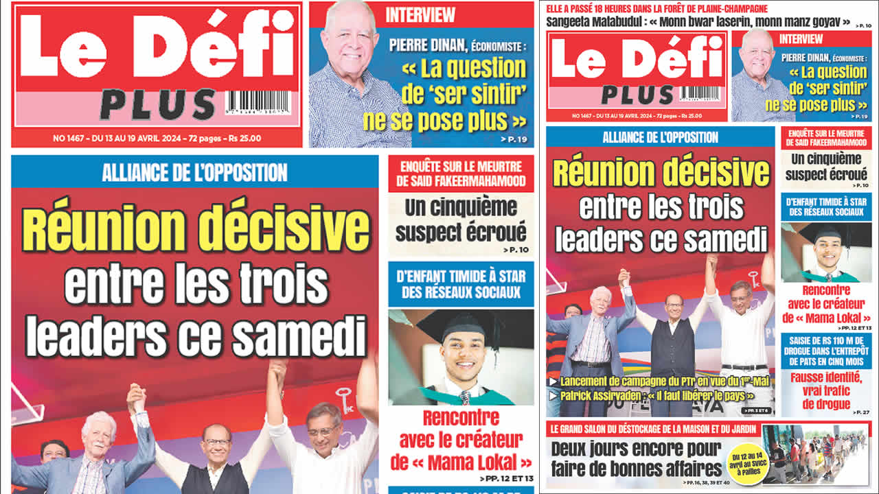 ? Voici la Une du Défi Plus. Le journal est en vente à Rs 25 l'exemplaire aux endroits habituels (supermarchés, boutiques, tabagies, superettes). Bonne lecture !