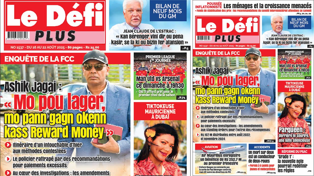 ? Voici la Une du Défi Plus. Le journal est en vente à Rs 25 l'exemplaire aux endroits habituels (supermarchés, boutiques, tabagies, superettes). Bonne lecture !