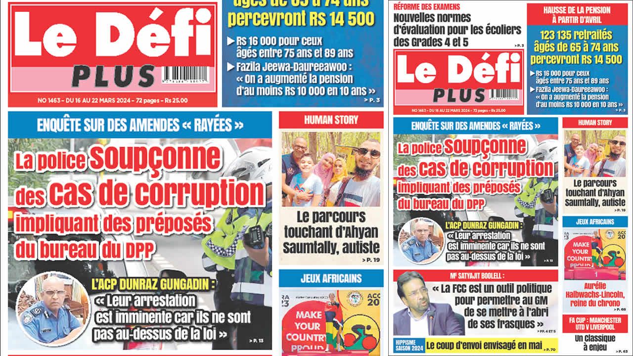 ? Voici la Une du Défi Plus. Le journal est en vente à Rs 25 l'exemplaire aux endroits habituels (supermarchés, boutiques, tabagies, superettes). Bonne lecture !