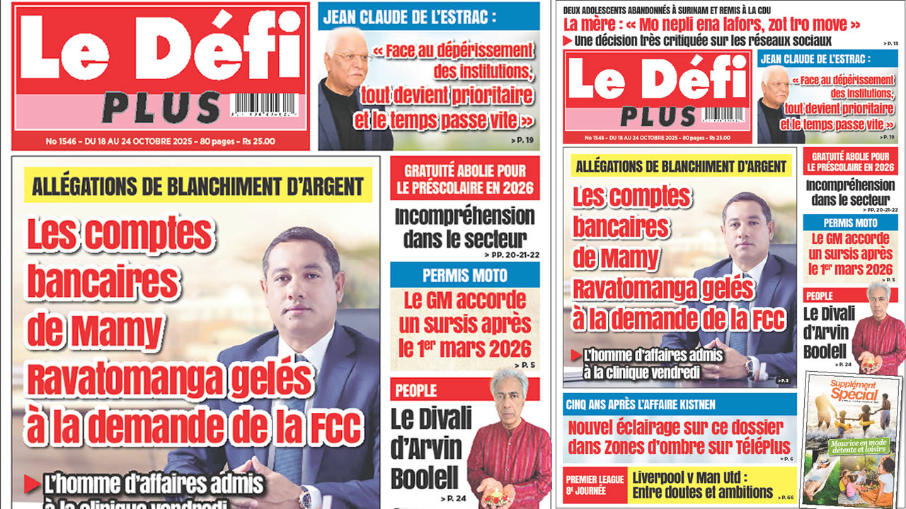 ? Voici la Une du Défi Plus. Le journal est en vente à Rs 25 l'exemplaire aux endroits habituels (supermarchés, boutiques, tabagies, superettes). Bonne lecture !