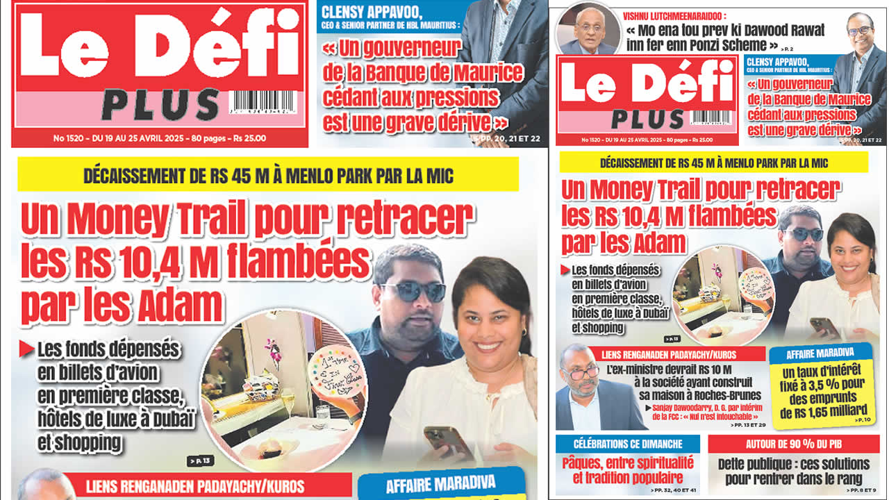 Voici la Une du Défi Plus. Le journal est en vente à Rs 25 l'exemplaire aux endroits habituels (supermarchés, boutiques, tabagies, superettes). Bonne lecture !