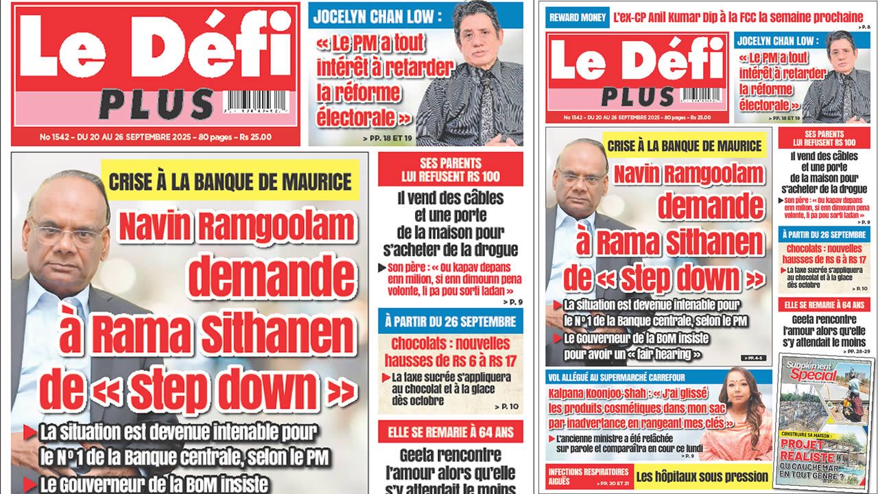 ? Voici la Une du Défi Plus. Le journal est en vente à Rs 25 l'exemplaire aux endroits habituels (supermarchés, boutiques, tabagies, superettes). Bonne lecture !