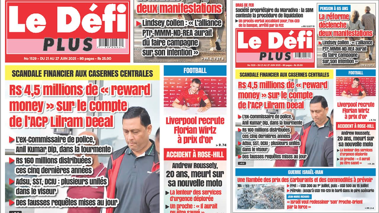 ? Voici la Une du Défi Plus. Le journal est en vente à Rs 25 l'exemplaire aux endroits habituels (supermarchés, boutiques, tabagies, superettes). Bonne lecture !