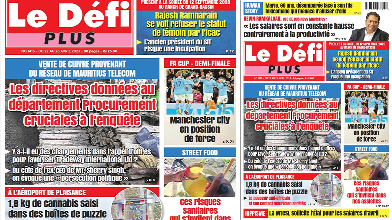 ? Voici la Une du Défi Plus. Le journal est en vente à Rs 25 l'exemplaire aux endroits habituels (supermarchés, boutiques, tabagies, superettes). Bonne lecture !