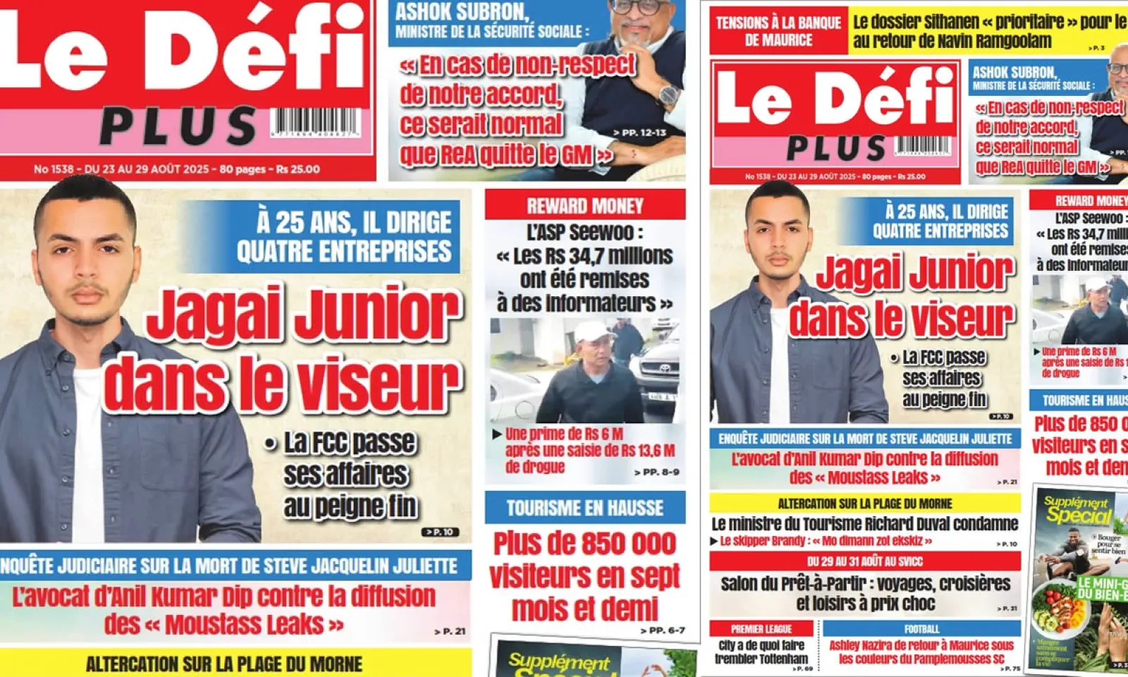 ? Voici la Une du Défi Plus. Le journal est en vente à Rs 25 l'exemplaire aux endroits habituels (supermarchés, boutiques, tabagies, superettes). Bonne lecture !