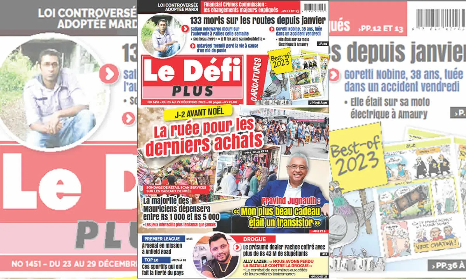 ? Voici la Une du Défi Plus. Le journal est en vente à Rs 25 l'exemplaire aux endroits habituels (supermarchés, boutiques, tabagies, superettes). Bonne lecture !
