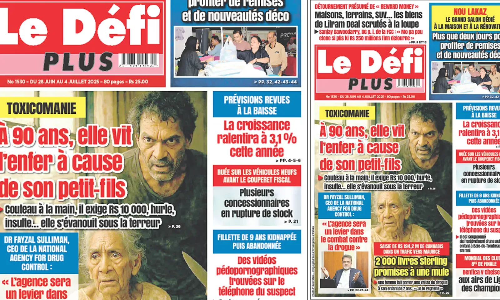 ? Voici la Une du Défi Plus. Le journal est en vente à Rs 25 l'exemplaire aux endroits habituels (supermarchés, boutiques, tabagies, superettes). Bonne lecture !