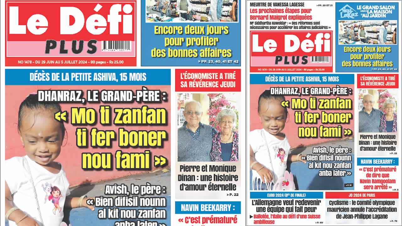 ? Voici la Une du Défi Plus. Le journal est en vente à Rs 25 l'exemplaire aux endroits habituels (supermarchés, boutiques, tabagies, superettes). Bonne lecture !