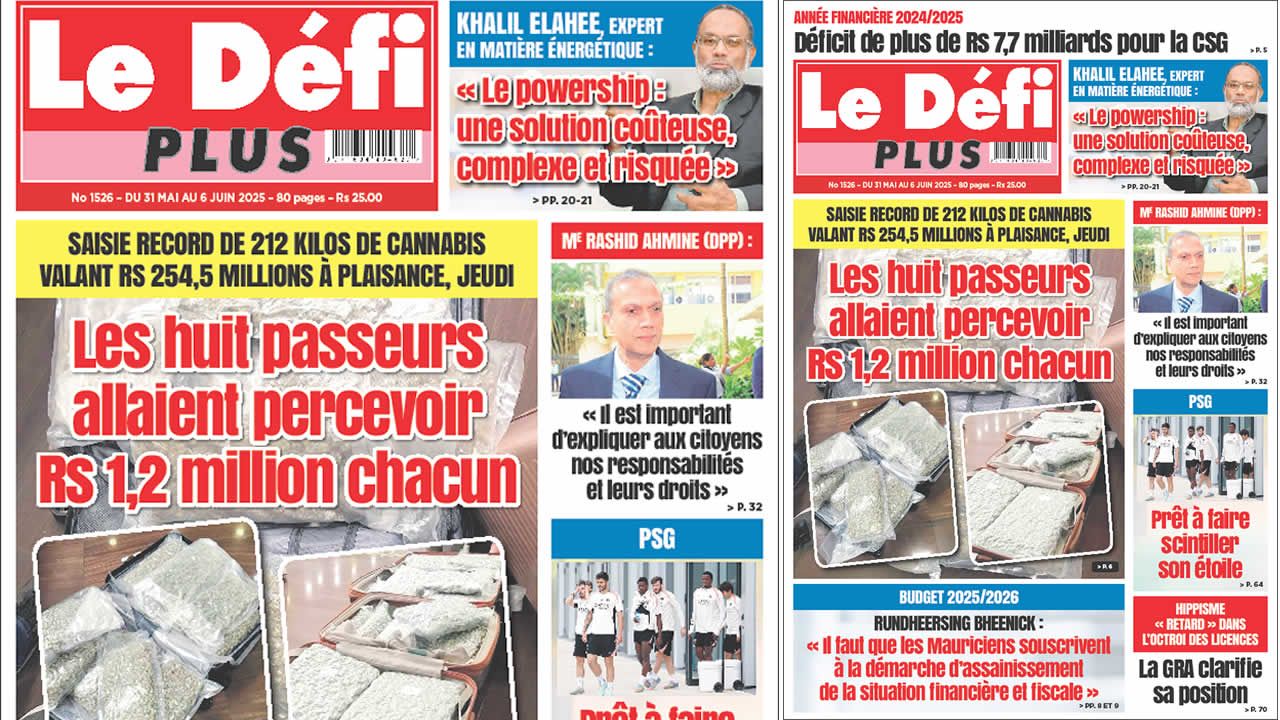 ? Voici la Une du Défi Plus. Le journal est en vente à Rs 25 l'exemplaire aux endroits habituels (supermarchés, boutiques, tabagies, superettes). Bonne lecture !