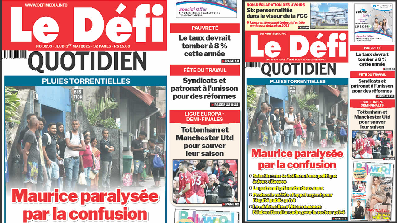 ? Voici la Une du Défi Quotidien. Le journal est en vente à Rs 15 l'exemplaire aux endroits habituels (supermarchés, boutiques, tabagies, superettes). Bonne lecture !