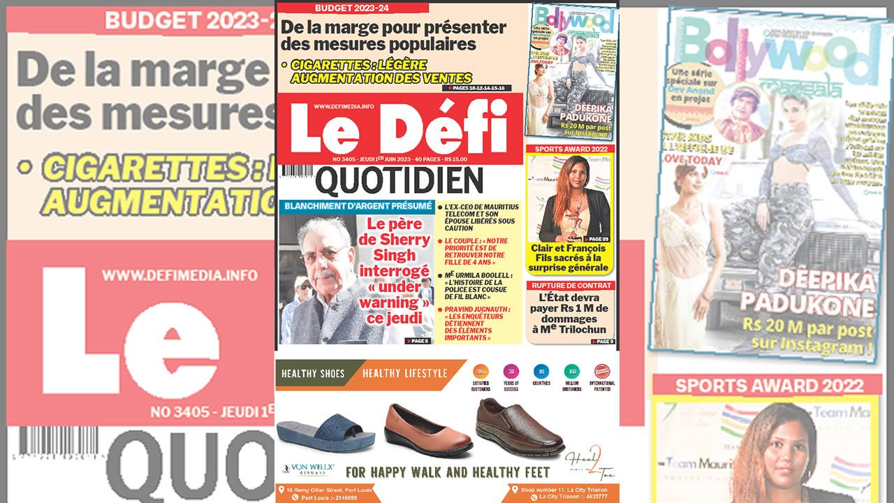 ? Voici la Une du Défi Quotidien. Le journal est en vente à Rs 15 l'exemplaire aux endroits habituels (supermarchés, boutiques, tabagies, superettes). Bonne lecture !