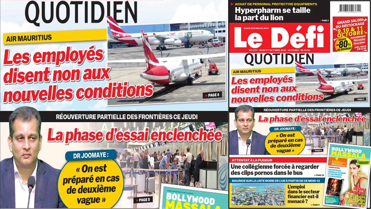 Voici la Une du Défi Quotidien. Le journal est en vente à Rs 15 l'exemplaire aux endroits habituels (supermarchés, boutiques, tabagies, superettes). Bonne lecture !