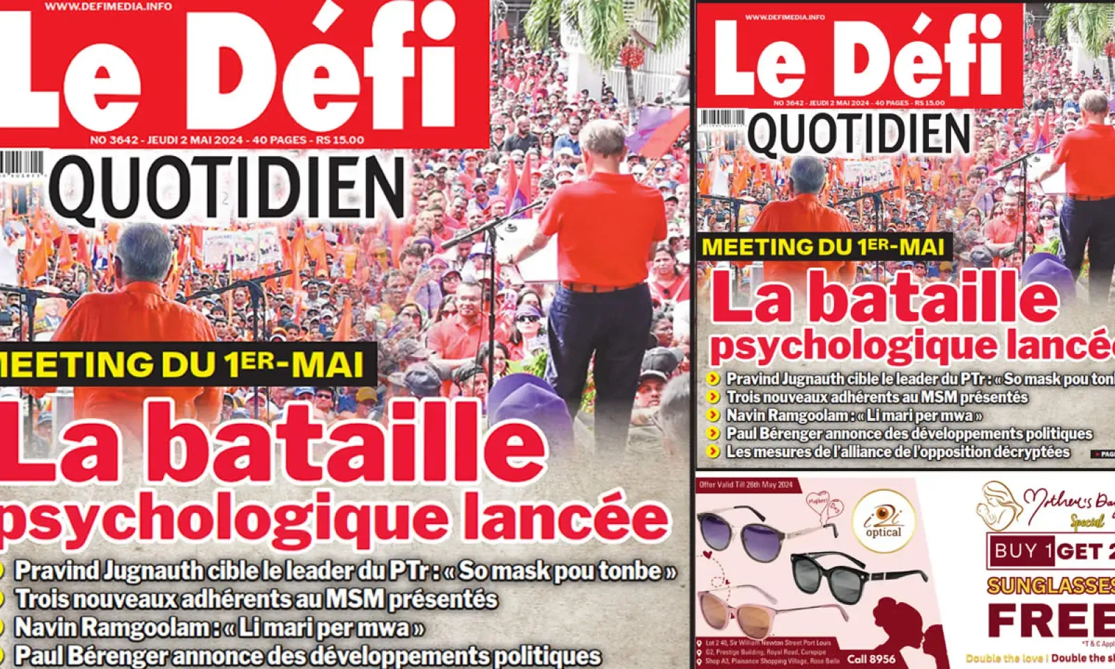 ? Voici la Une du Défi Quotidien. Le journal est en vente à Rs 15 l'exemplaire aux endroits habituels (supermarchés, boutiques, tabagies, superettes). Bonne lecture !