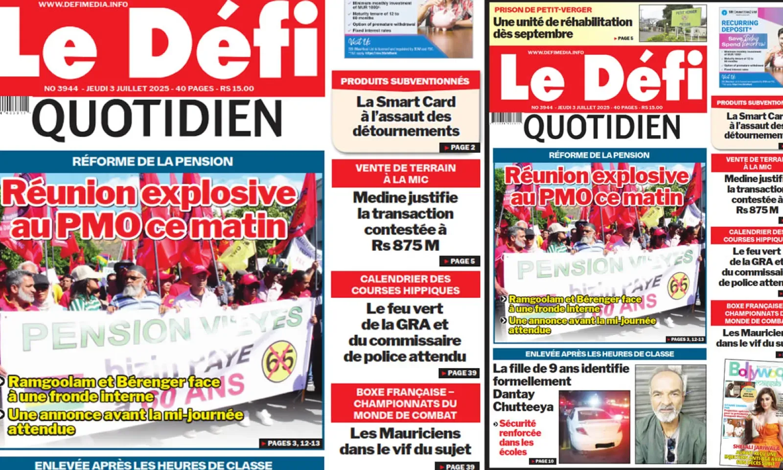 ? Voici la Une du Défi Quotidien. Le journal est en vente à Rs 15 l'exemplaire aux endroits habituels (supermarchés, boutiques, tabagies, superettes). Bonne lecture !