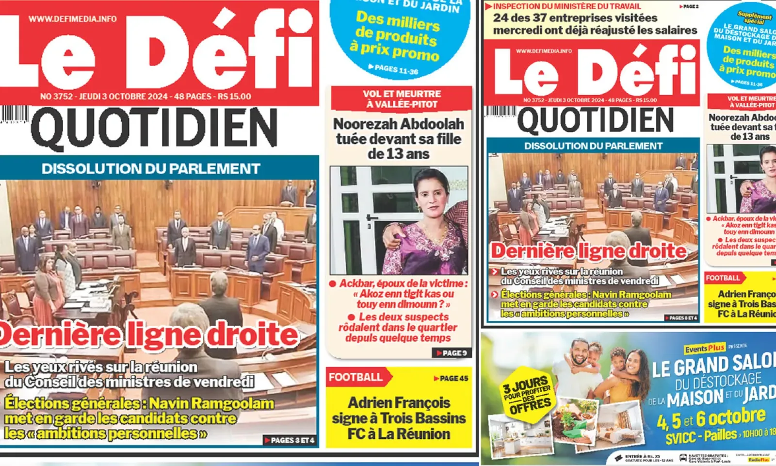 ? Voici la Une du Défi Quotidien. Le journal est en vente à Rs 15 l'exemplaire aux endroits habituels (supermarchés, boutiques, tabagies, superettes). Bonne lecture !