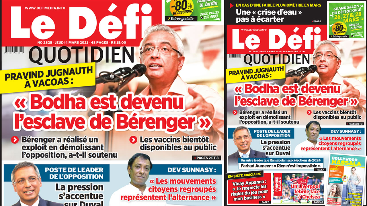 ? Voici la Une du Défi Quotidien. Le journal est en vente à Rs 15 l'exemplaire aux endroits habituels (supermarchés, boutiques, tabagies, superettes). Bonne lecture !
