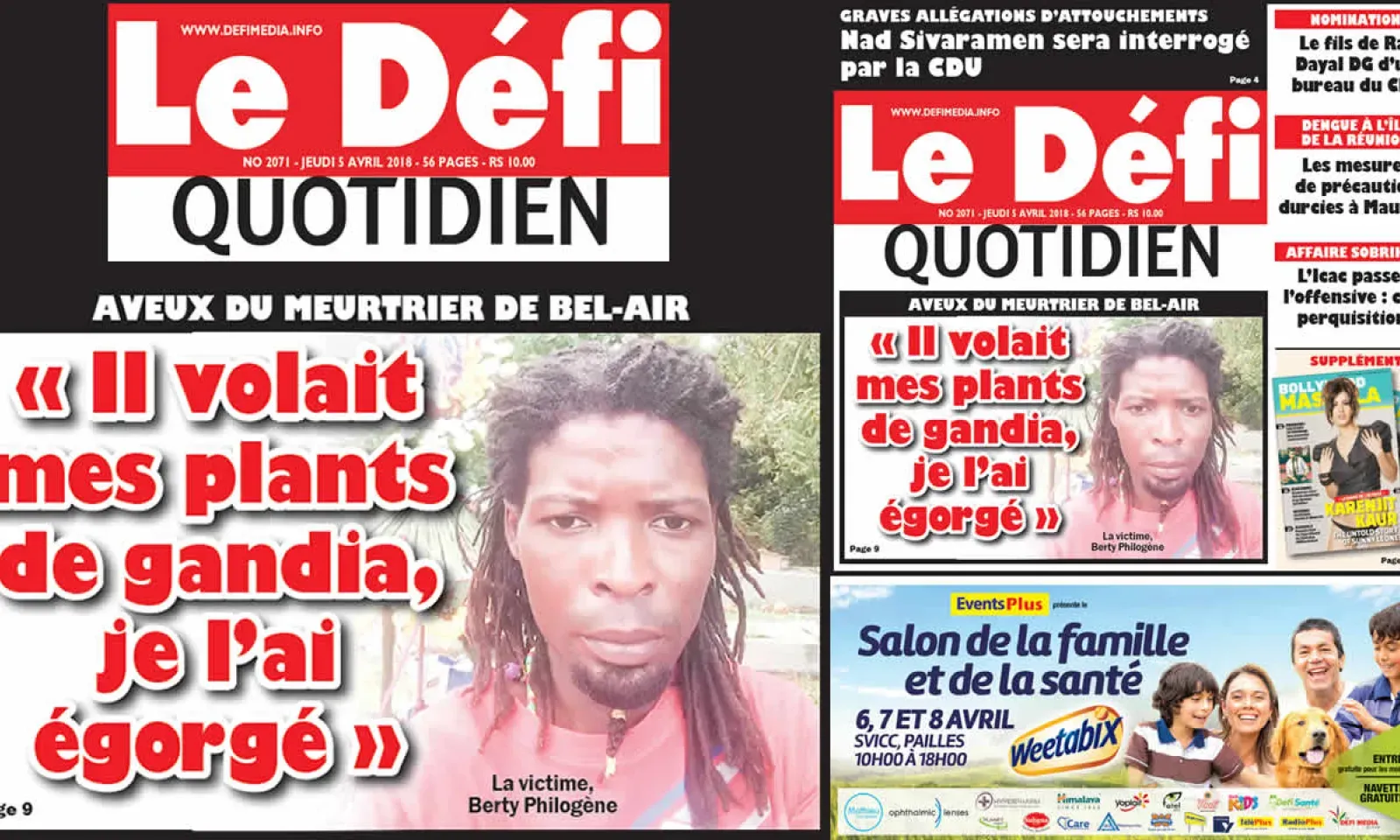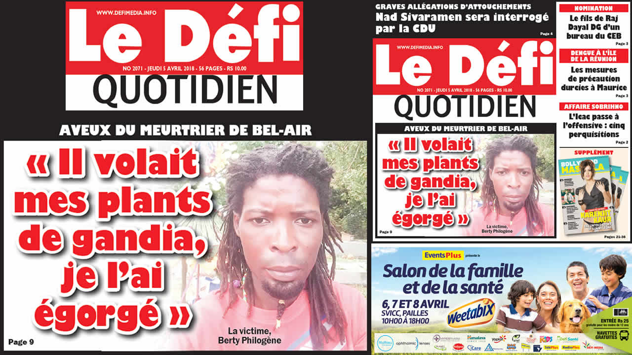 Développement dans l’enquête sur le meurtre de Marc Berty David Philogène, 34 ans, égorgé et abandonné dans un champ de canne à Beau-Champ. Satchidanand Sidhari, 38 ans, un laboureur, de Camp-des-Pécheurs, ancien ami proche avec la victime est passé aux aveux, mercredi. « Li ti pe kokin mo bann plant gandia » a-t-il reconnu. L’arme du crime, un sabre, et des vêtements tachés du sang de la victime ont été récupérés.