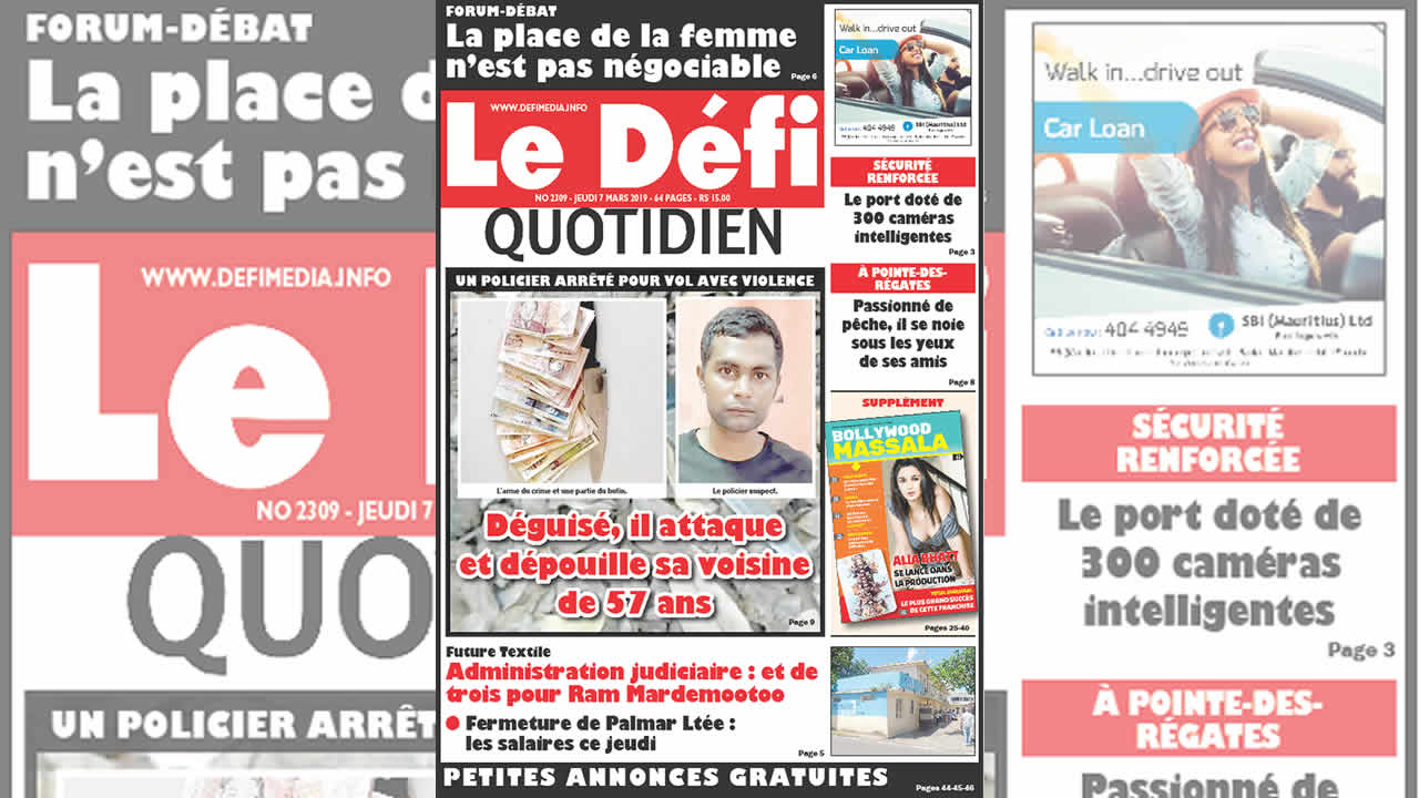 Narainsamy Goinsamy Arasen, un policier de 26 ans, est derrière les barreaux. Ce constable du poste de Piton a été épinglé mercredi matin, alors qu’il venait de commettre un vol avec violence sur sa voisine, gérante d’une boutique à Triolet. Déguisé en vieil homme, il a blessé la dame au couteau avant de repartir avec Rs 70 000.