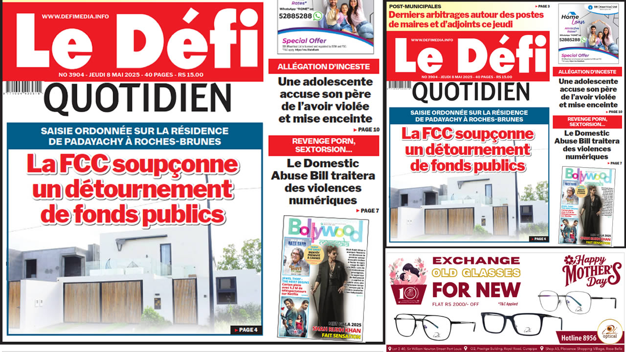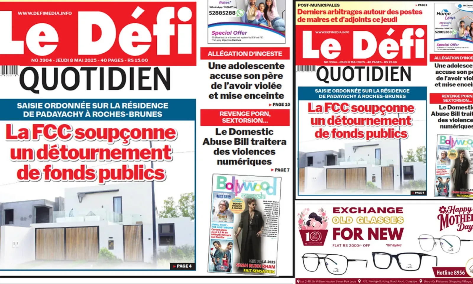 ? Voici la Une du Défi Quotidien. Le journal est en vente à Rs 15 l'exemplaire aux endroits habituels (supermarchés, boutiques, tabagies, superettes). Bonne lecture !