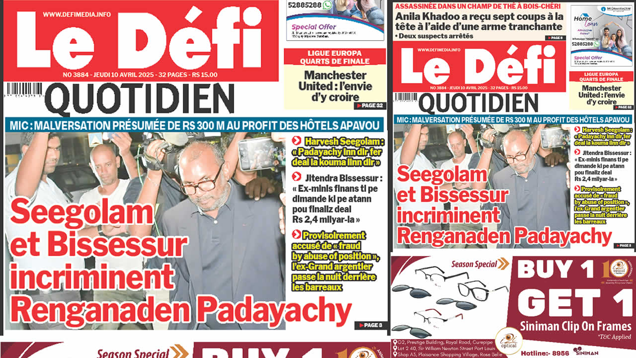 ? Voici la Une du Défi Quotidien. Le journal est en vente à Rs 15 l'exemplaire aux endroits habituels (supermarchés, boutiques, tabagies, superettes). Bonne lecture !