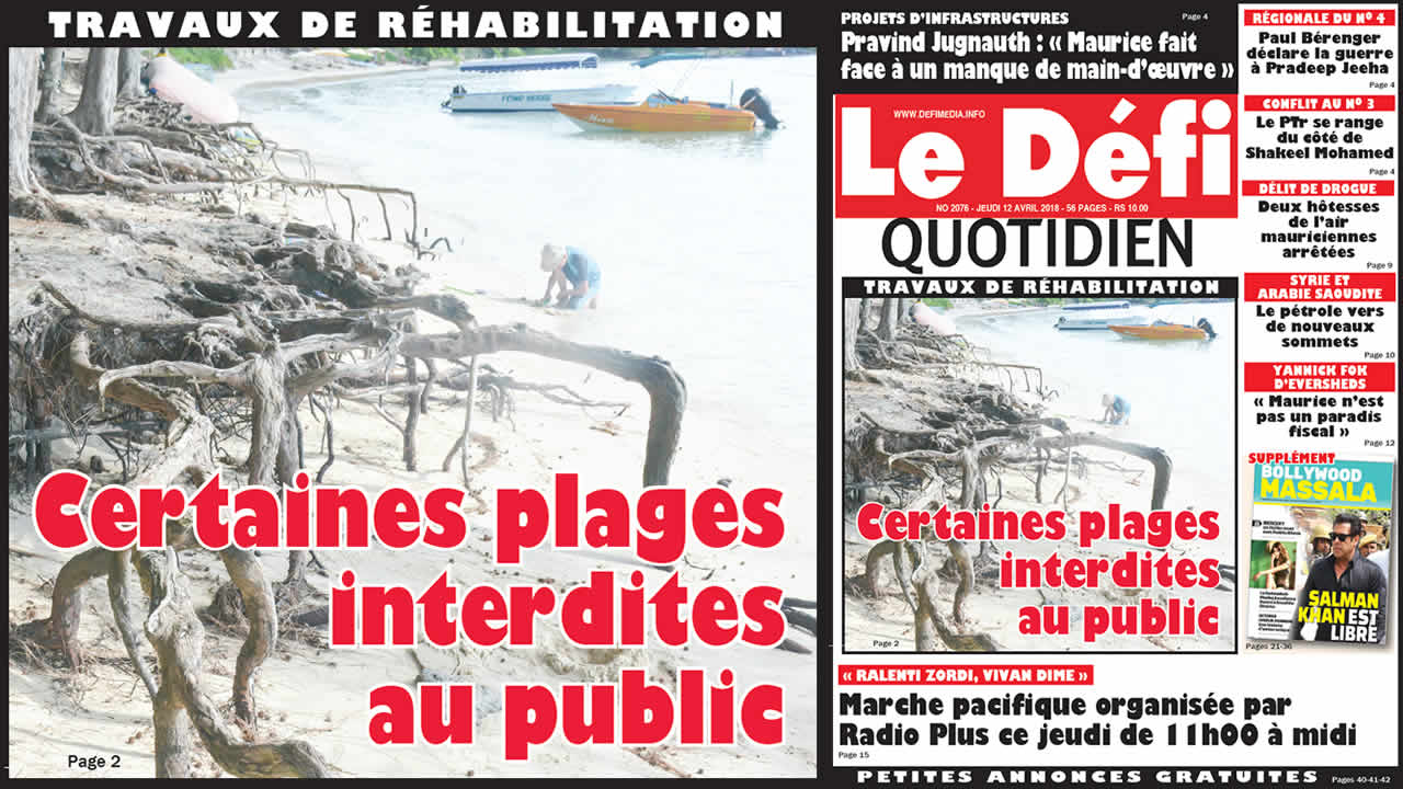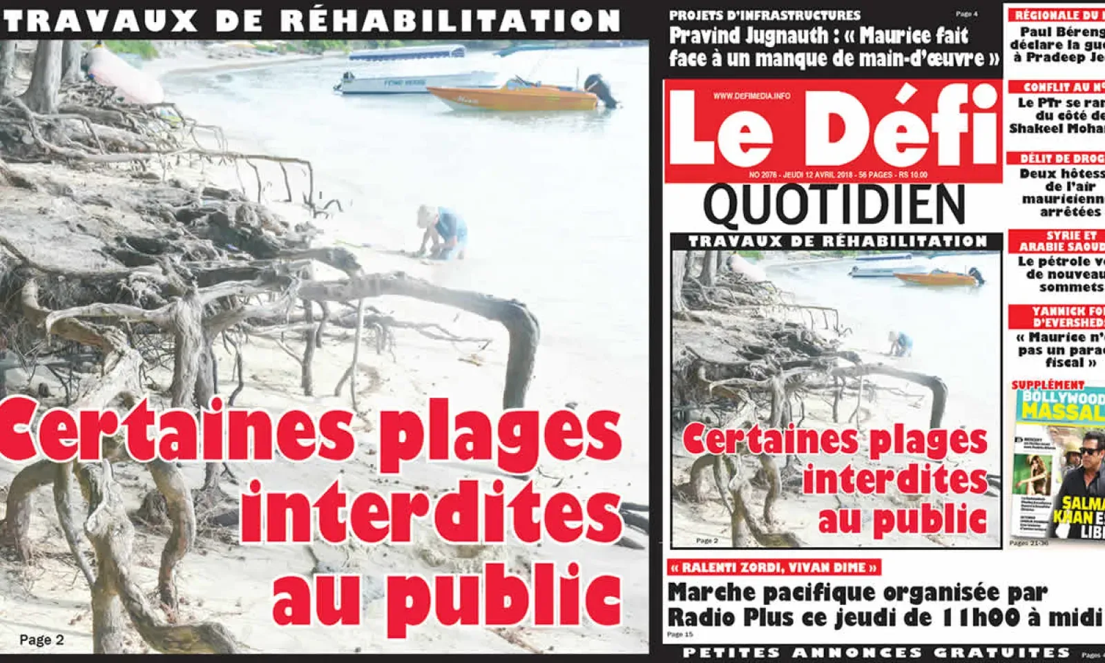 Gênant mais nécessaire. Le public est averti, certaines plages deviendront des chantiers dans moins de trois mois. Elles ont besoin d’être reconstituées car elles ont été entamées par l’érosion. Parmi celles touchées il y a deux plages très fréquentées ,celle de Baie-du-Tombeau et celle de Mon Choisy.