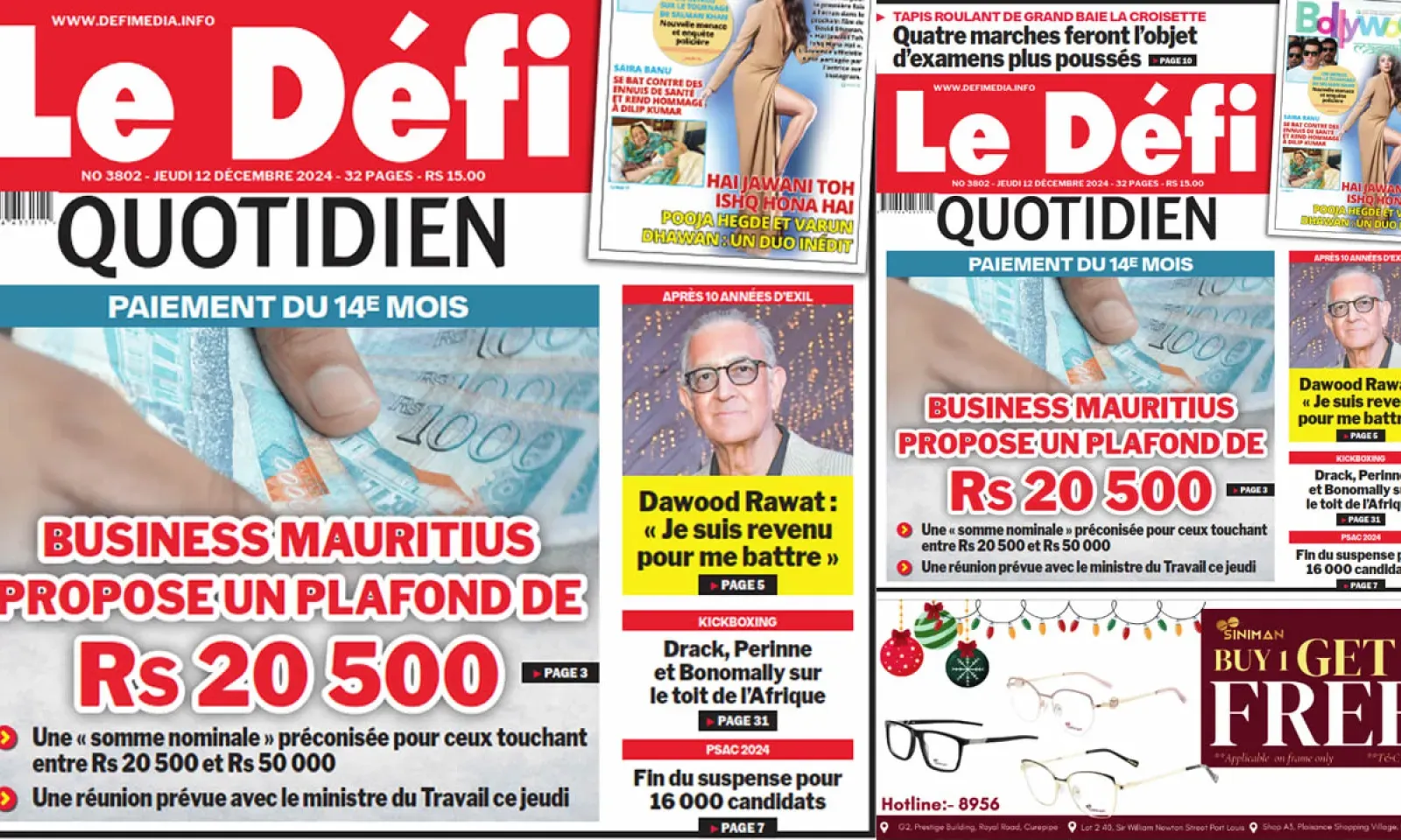 ? Voici la Une du Défi Quotidien. Le journal est en vente à Rs 15 l'exemplaire aux endroits habituels (supermarchés, boutiques, tabagies, superettes). Bonne lecture !