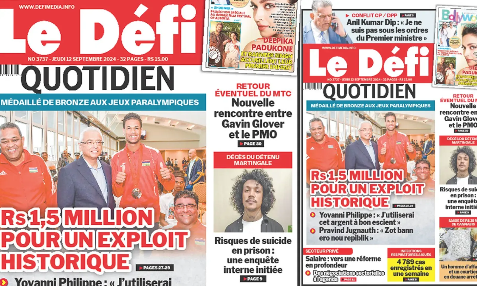 ? Voici la Une du Défi Quotidien. Le journal est en vente à Rs 15 l'exemplaire aux endroits habituels (supermarchés, boutiques, tabagies, superettes). Bonne lecture !