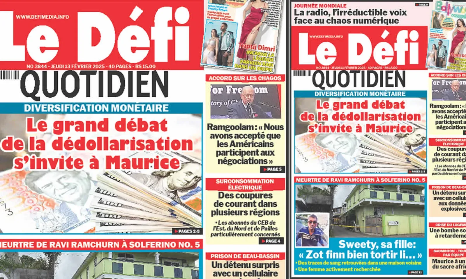 ? Voici la Une du Défi Quotidien. Le journal est en vente à Rs 15 l'exemplaire aux endroits habituels (supermarchés, boutiques, tabagies, superettes). Bonne lecture !