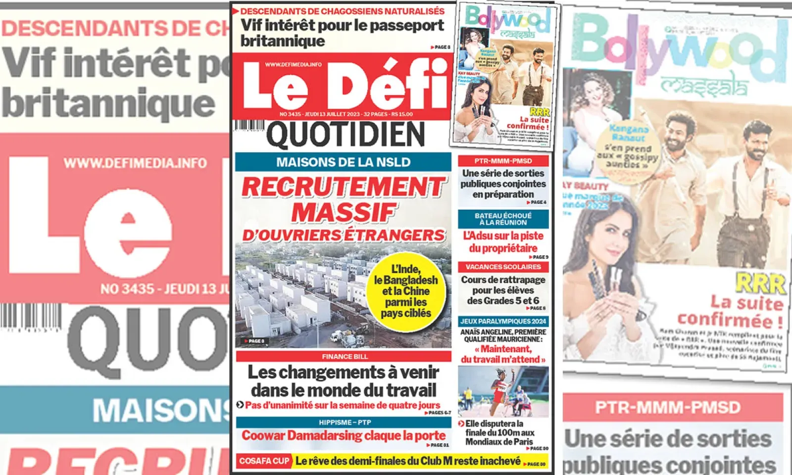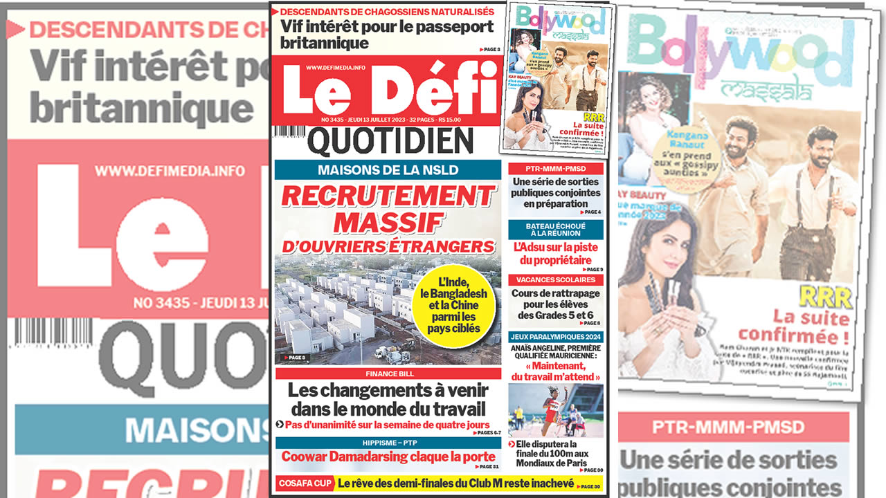 ? Voici la Une du Défi Quotidien. Le journal est en vente à Rs 15 l'exemplaire aux endroits habituels (supermarchés, boutiques, tabagies, superettes). Bonne lecture !