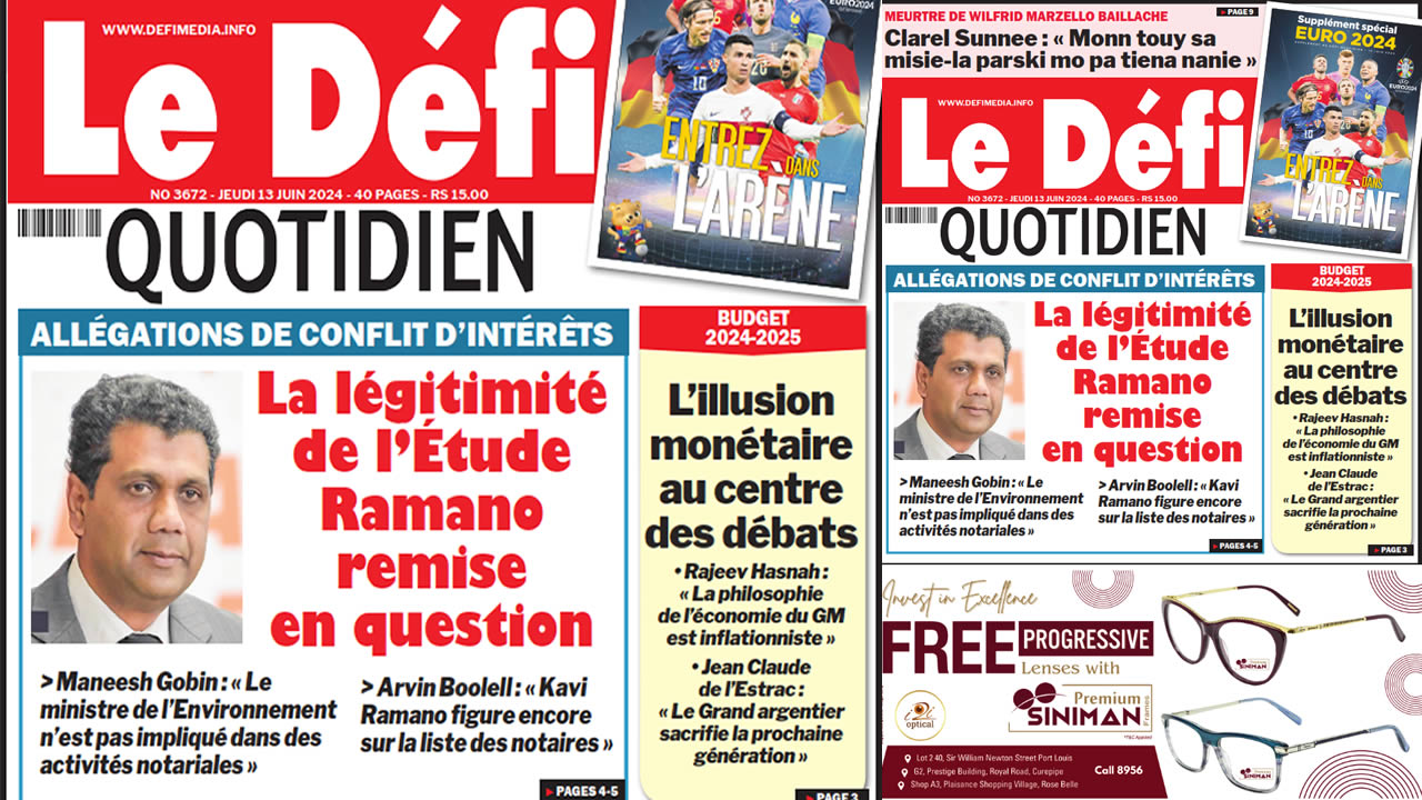 ? Voici la Une du Défi Quotidien. Le journal est en vente à Rs 15 l'exemplaire aux endroits habituels (supermarchés, boutiques, tabagies, superettes). Bonne lecture !