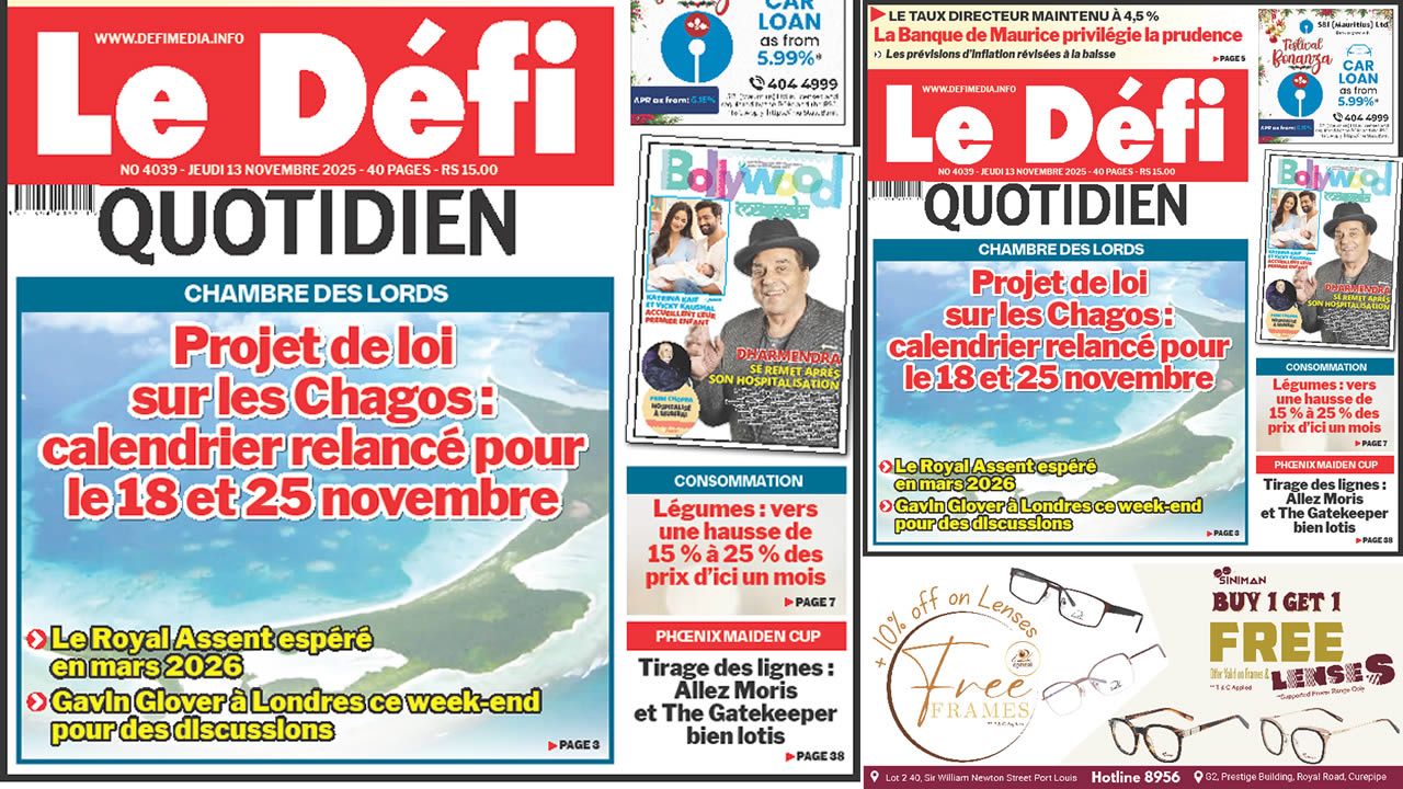 📰 Voici la Une du DĂ©fi Quotidien. Le journal est en vente Ă  Rs 15 l'exemplaire aux endroits habituels (supermarchĂ©s, boutiques, tabagies, superettes). Bonne lecture !