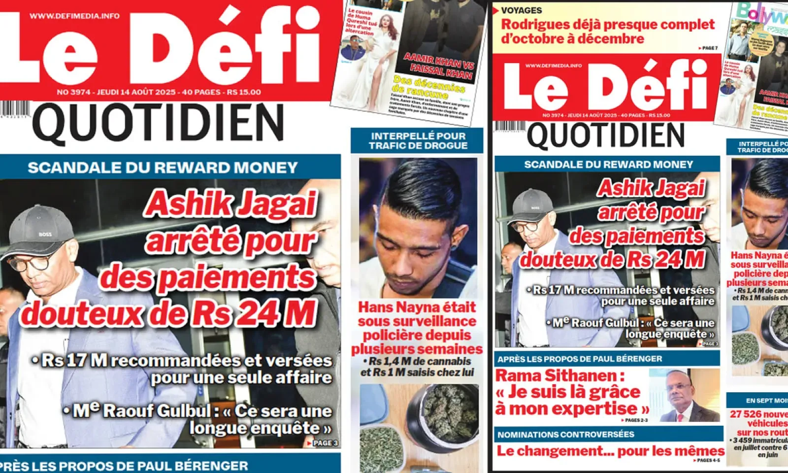 Voici la une du Défi Quotidien de ce Jeudi 14 Août 2025