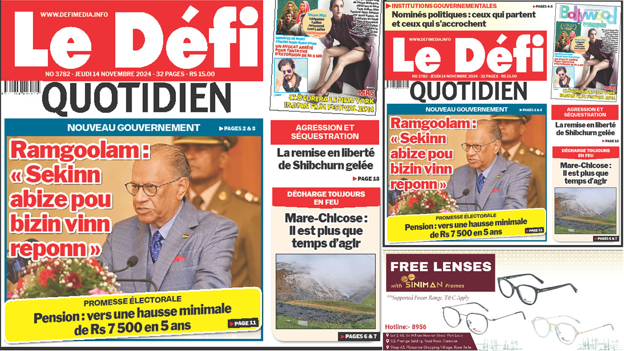 ? Voici la Une du Défi Quotidien. Le journal est en vente à Rs 15 l'exemplaire aux endroits habituels (supermarchés, boutiques, tabagies, superettes). Bonne lecture !