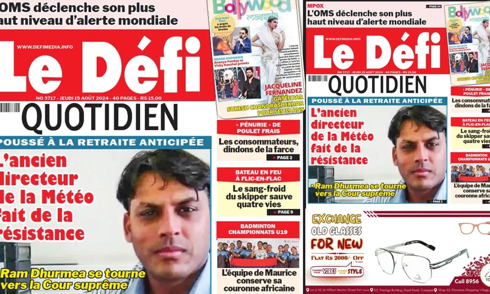 ? Voici la Une du Défi Quotidien. Le journal est en vente à Rs 15 l'exemplaire aux endroits habituels (supermarchés, boutiques, tabagies, superettes). Bonne lecture !