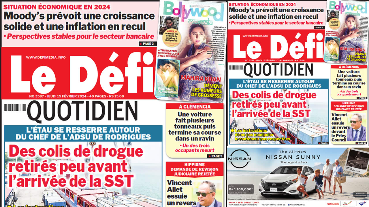 ? Voici la Une du Défi Quotidien. Le journal est en vente à Rs 15 l'exemplaire aux endroits habituels (supermarchés, boutiques, tabagies, superettes). Bonne lecture !