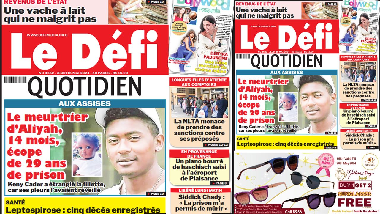 ? Voici la Une du Défi Quotidien. Le journal est en vente à Rs 15 l'exemplaire aux endroits habituels (supermarchés, boutiques, tabagies, superettes). Bonne lecture !