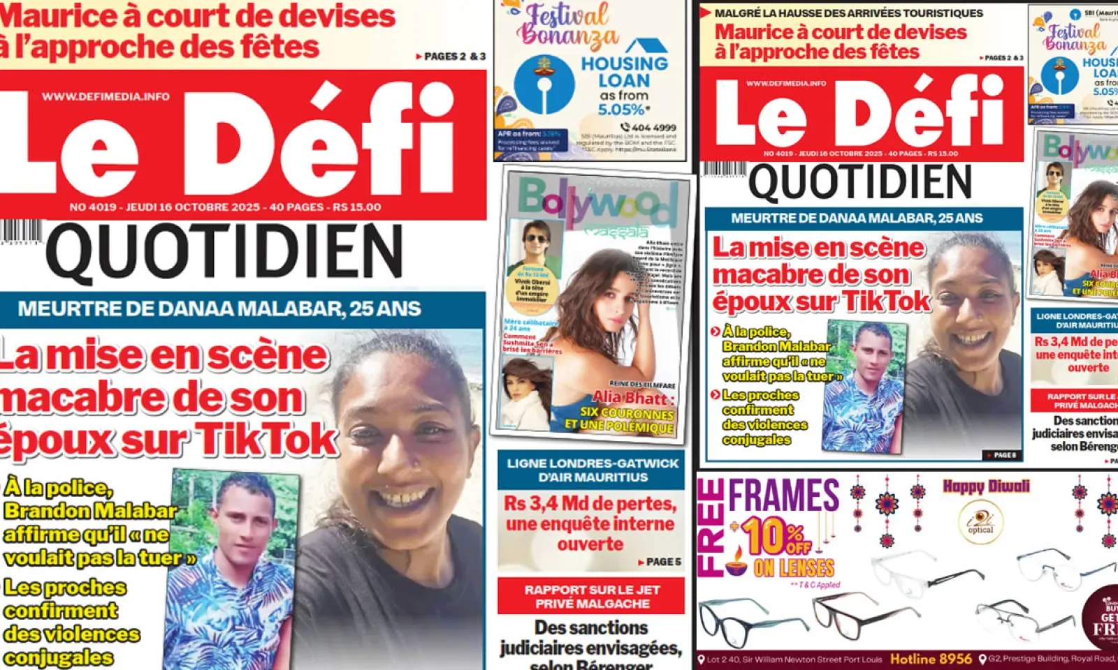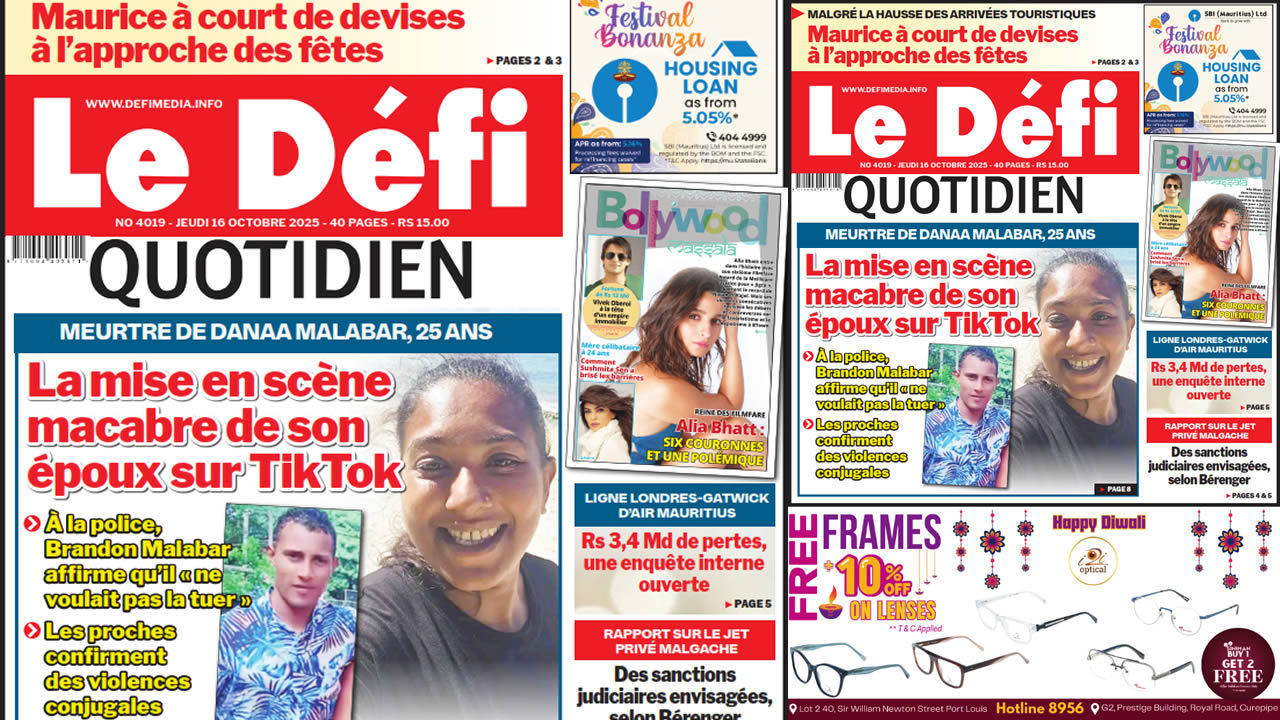 ? Voici la Une du Défi Quotidien. Le journal est en vente à Rs 15 l'exemplaire aux endroits habituels (supermarchés, boutiques, tabagies, superettes). Bonne lecture !